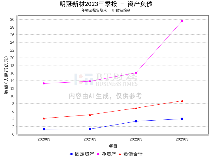 从资产负债表中,我们可以看到,明冠新材2023年三季度末的资产总计为38.3亿元,相比上年度末的37.49亿元有所增加。然而,负债合计也从上年度末的5.99亿元增长到本报告期末的8.74亿元,资产负债率也从上年度末的15.98%上升到本报告期末的22.81%,这表明公司的负债压力有所增大。同时,公司的净资产从上年度末的31.5亿元下降到本报告期末的29.56亿元。