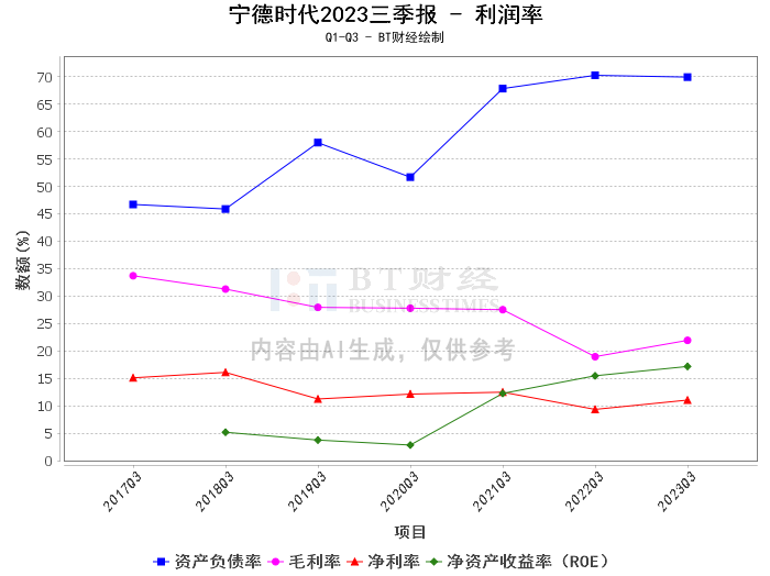 综合来看,宁德时代在2023年三季度的经营状况良好,各项主要财务指标均表现出较好的增长态势。公司净资产、净利润的增长显著,资产负债率、毛利率和净利率等关键财务指标也表现出稳健的态势。