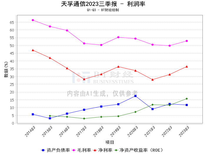总的来看,天孚通信2023年三季报显示,公司在净资产、资产负债率、毛利率、净利润、毛利润、净利率、资产收益率(ROE)等关键财务指标上都表现出稳健的增长态势。公司的盈利能力和资产运营效率都有所提升,财务状况健康。预计在未来,公司将继续保持稳健的发展态势。
