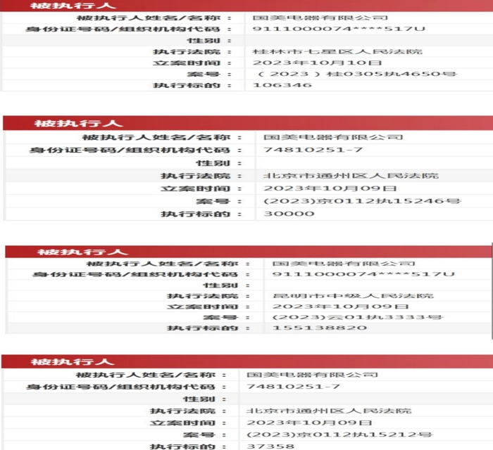 此前中国执行信息公开网显示,10月9日至10日,国美电器有限公司新增4条被执行人信息,执行标的合计约1.55亿元。需要注意的是北京市通州区人民法院的判罚,执行标的仅为3万元,曾经三次成为中国首富的黄光裕,到如今因3万元被执行成为失信人。
