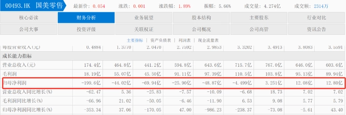 2023年上半年,国美总营收4.148亿元,同比下滑96.57%,归母净利润-35.39亿元,同比下滑19.33%。近三个报告期内营收均出现大幅下滑,此前两个报告期营收分别下滑53.5%和62.47%,归母净利润同比下滑50.24%和353.34%。