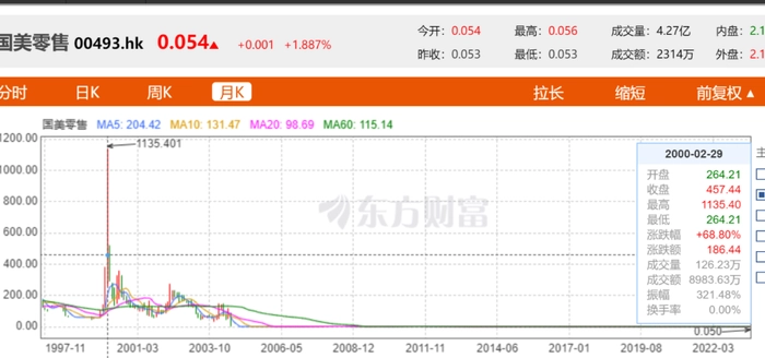 国美股价也由最高的1135.401港元直接跌至如今的0.054港元,总市值仅为25.79亿港元。自2021年7月9日1港元开盘至今,其股价再没上过1港元,今年7月19日跌破0.1港元后,长期在0.1港元以下徘徊,成为名副其实的“仙股”。