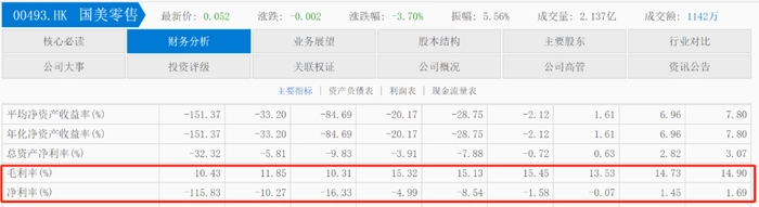 其实国美走到这一步令市场十分惋惜。通过国美的多年财报梳理可以发现,多年的负债让国美一直处于危险边缘。让资本担忧的是国美的盈利能力堪忧,已经连续6年亏损。在毛利率和净利率衡量盈利能力的两项重要指标中,国美均出现大幅下滑。2022年,国美的毛利率为10.43%,成为近9年内的第二新低,仅高于2020年的10.31%,要知道2020年是疫情最严重的一年,那一年的毛利率低情有可原,但在2022年还持续走低,说明国美的盈利能力下滑。在净利率方面,国美已经连续7年为负值,即便是为正数的前几年,净利率也低至1.45%左右。