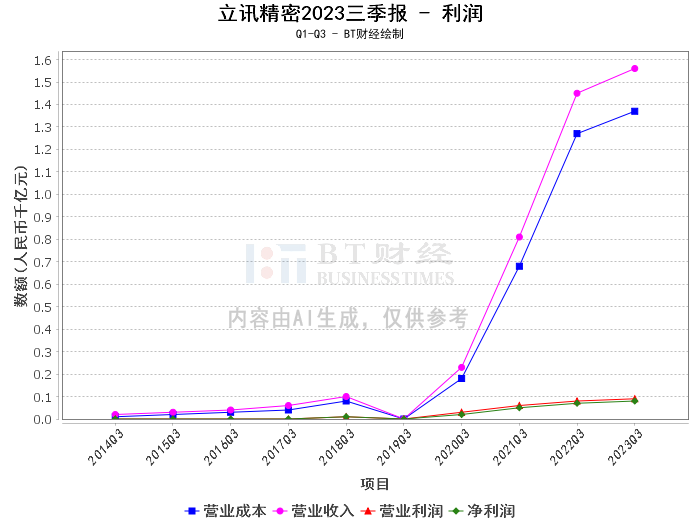 立讯精密工业股份有限公司(股票代码:002475)是一家主要从事消费电子、汽车和通讯业务的公司。近期,该公司发布了其2023年三季度财报。根据财报数据,立讯精密在报告期内实现了稳健的业绩增长,且其多元化战略成效显著。