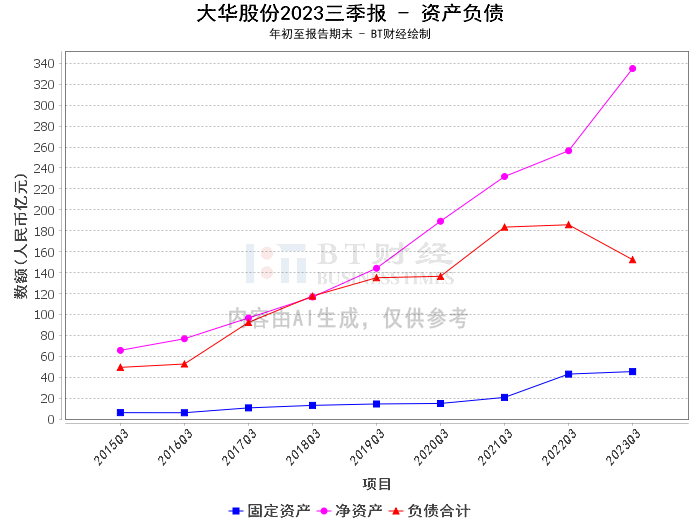 在财务数据方面,大华股份2023年三季度的表现亮眼。公司的资产总计由上年度末的4.63百亿元增长到本报告期末的4.87百亿元,负债合计则由上年度末的2百亿元降低到本报告期末的1.52百亿元。这表明公司在资产管理上取得了积极的成效,同时也在有效控制负债方面做出了努力。
