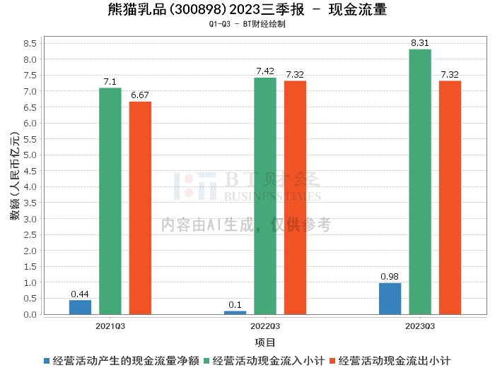 在现金流量方面,2023年前三季度,熊猫乳品的经营活动产生的现金流量净额为9839.88万元,相比上年同期的1047.56万元大幅增长了839.31%。经营活动现金流入小计为8.31亿元,相比上年同期的7.42亿元增长了11.97%。经营活动现金流出小计为7.32亿元,与上年同期的7.32亿元持平。这些数据表明,公司的现金流量状况良好,经营活动产生的现金流量净额大幅提升,主要系销售增长导致回款增加。