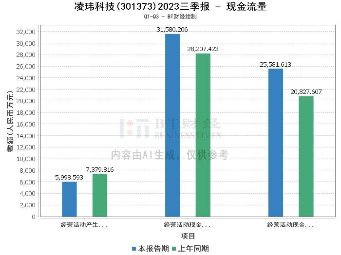 在现金流量方面,凌玮科技2023年三季度经营活动产生的现金流量净额为5998.59万元,相比上年同期的7379.82万元有所减少。经营活动现金流入小计为3.16亿元,相比上年同期的2.82亿元有所增长。经营活动现金流出小计为2.56亿元,相比上年同期的2.08亿元有所增长。这些数据显示出公司的现金流量状况较为稳定,尽管经营活动产生的现金流量净额有所减少,但经营活动的现金流入和流出都在增加,主要本期购买商品支付的现金及缴纳的税款增加所致。