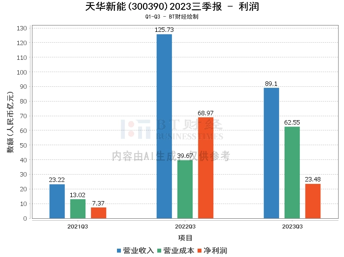 在利润方面,公司2023年三季度的营业收入为89.1亿元,相比上年同期的125.73亿元有所下滑。营业成本为62.55亿元,较上年同期的39.67亿元大幅增加。毛利率为29.81%,较上年同期的68.45%大幅下降,主要原因系本期天宜锂业原材料成本较上期大幅增加所致。净利润为23.48亿元,较上年同期的68.97亿元大幅下滑,净利率为26.35%,较上年同期的54.85%也有所下降。