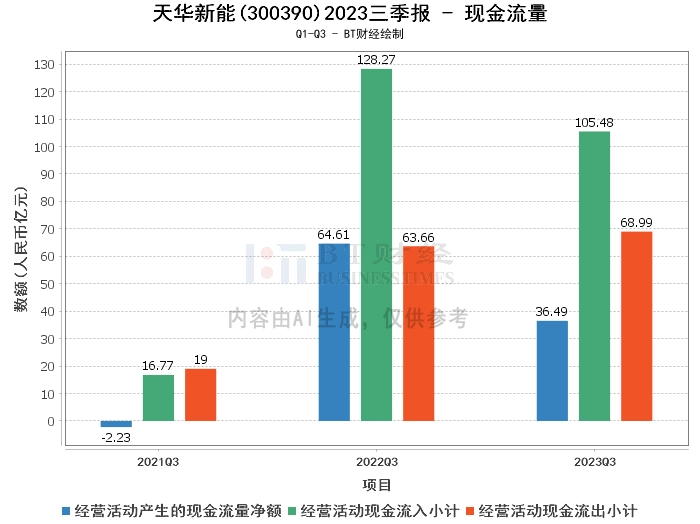 在现金流量方面,公司2023年三季度经营活动产生的现金流量净额为36.49亿元,较上年同期的64.61亿元有所下滑。经营活动现金流入小计为105.48亿元,较上年同期的128.27亿元有所减少。经营活动现金流出小计为68.99亿元,较上年同期的63.66亿元有所增加。