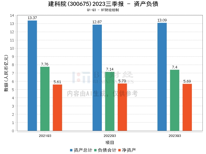 从资产负债方面看,建科院2023年三季度的总资产为13.09亿元,相比上年度末的13.87亿元有所下降。负债总额为7.4亿元,相比上年度末的7.59亿元略有减少。净资产为5.69亿元,相比上年度末的6.28亿元有所减少。资产负债率为56.54%,相比上年度末的54.74%有所上升。这些变化主要是由于公司经营性现金净流出、购置资产、偿还借款和支付利息及代建项目款项支付等原因导致的。
