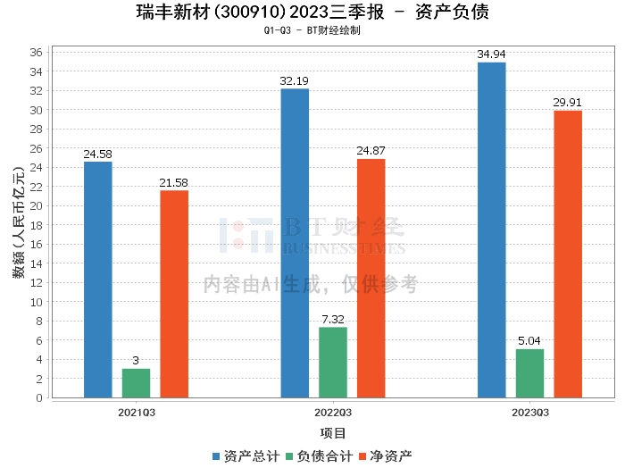 从资产负债方面来看,瑞丰新材2023年三季度的总资产为34.94亿元,相比上年度末的33.96亿元有所增长。负债合计为5.04亿元,较上年度末的6.44亿元有所下降。净资产为29.91亿元,较上年度末的27.53亿元有所增长。资产负债率为14.41%,较上年度末的18.95%有所下降。这些数据表明,公司的资产规模在稳步增长,负债规模在逐步降低,整体资产负债状况良好。