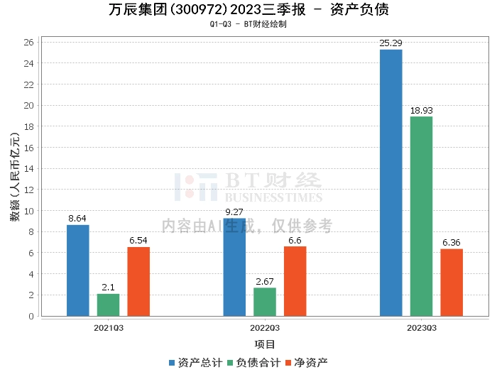 从资产负债方面来看,2023年三季度末,万辰集团的总资产达到25.29亿元,相较于上年度末的12.01亿元,增长了一倍多。负债合计为18.93亿元,大幅度增长,相较于上年度末的5.29亿元,增长了2.58倍。净资产为6.36亿元,相较于上年度末的6.72亿元有所下降。资产负债率为74.86%,相较于上年度末的44.02%,增长了30.84个百分点。