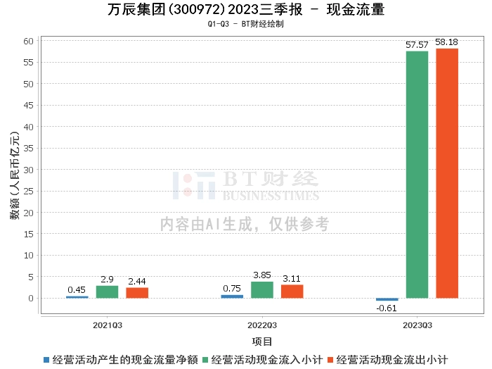 在现金流量方面,2023年三季度,万辰集团的经营活动产生的现金流量净额为-6092.55万元,相较于上年同期的7451万元,由正转负。经营活动现金流入小计为57.57亿元,相较于上年同期的3.85亿元,增长了14.95倍。经营活动现金流出小计为58.18亿元,相较于上年同期的3.11亿元,增长了18.71倍。主要系报告期量贩零食业务尚处于发展初期,正在快速拓展业务,经营资金流出量大于流入量。