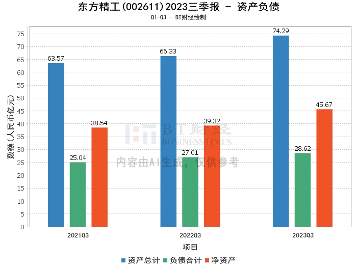 从资产负债方面来看,东方精工2023年三季度的总资产为74.29亿元,相比上年度末的69.29亿元有所增长。负债合计为28.62亿元,较上年度末的26.63亿元有所上升。净资产为45.67亿元,较上年度末的42.66亿元有所增长。资产负债率为38.52%,与上年度末的38.43%相比基本持平。这表明公司的资产负债结构稳定,财务状况良好。