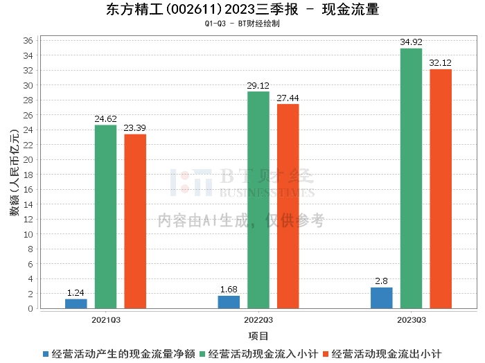 在现金流量方面,东方精工2023年三季度经营活动产生的现金流量净额为2.8亿元,较上年同期的1.68亿元增长了66.40%,主要系销售增长所致。这表明公司的经营活动产生的现金流量良好,有利于公司的日常运营和发展。