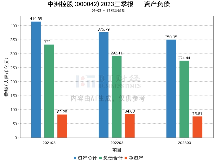 从资产负债方面看,2023年三季度末,中洲控股的总资产为350.05亿元,相比上年度末的366.87亿元有所减少。负债合计为274.44亿元,较上年度末的284.71亿元减少。净资产为75.61亿元,较上年度末的82.16亿元有所下降。资产负债率为78.4%,较上年度末的77.6%有所上升。