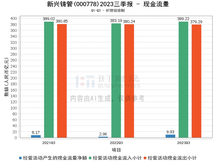 从现金流量方面来看,新兴铸管2023年三季度的经营活动产生的现金流量净额为9.93亿元,相比上年同期的2.96亿元增长235.90%。经营活动现金流入小计为389.22亿元,较上年同期的383.19亿元略有增长。经营活动现金流出小计为379.29亿元,较上年同期的380.24亿元略有下降。