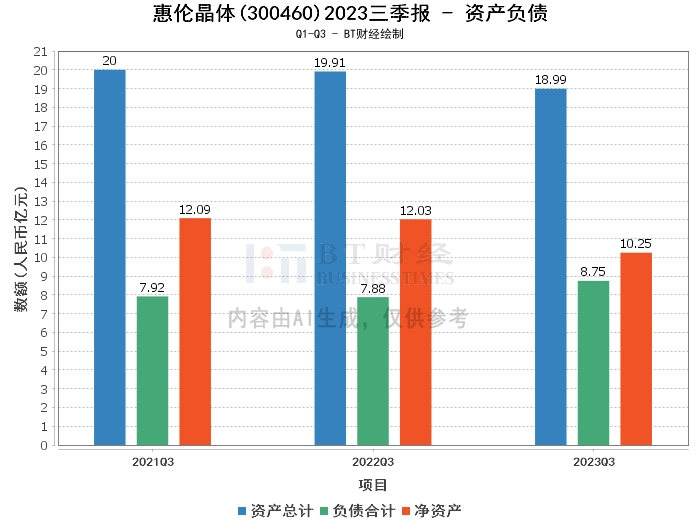 在资产负债方面,惠伦晶体2023年三季度的总资产为18.99亿元,相比上年度末的19.34亿元有所下降。负债合计为8.75亿元,相比上年度末的8.84亿元略有减少。公司的净资产为10.25亿元,较上年度末的10.5亿元有所减少。资产负债率为46.05%,较上年度末的45.72%略有上升。这些变化主要是由于公司偿还到期借款导致。