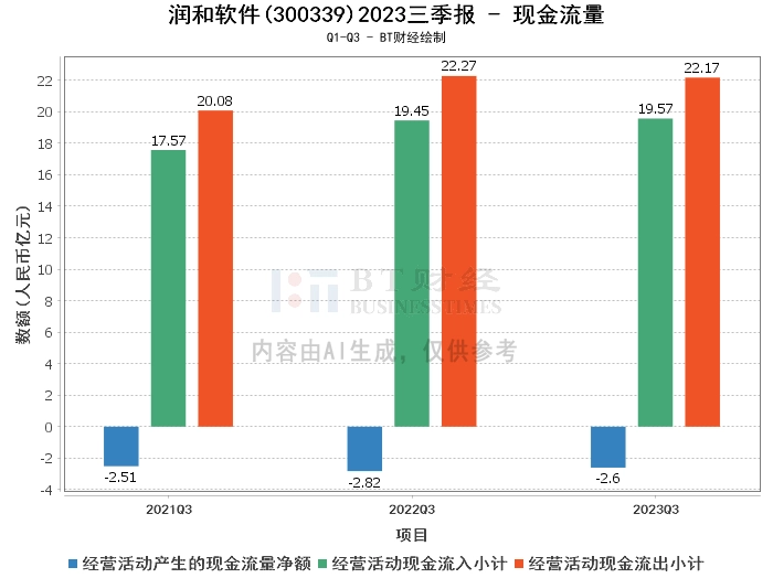 在现金流量方面,润和软件2023年三季度的经营活动现金流入小计为19.57亿元,相比上年同期的19.45亿元略有增长。经营活动现金流出小计为22.17亿元,相比上年同期的22.27亿元略有减少。这些数据显示,润和软件的现金流量管理稳健,经营活动产生的现金流量净额保持在一定水平。