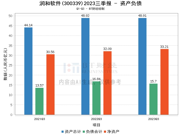 润和软件2023年三季度的总资产为48.91亿元,相比上年度末的48.05亿元有所增长。负债合计为15.7亿元,相比上年度末的15.99亿元有所减少。净资产为33.21亿元,相比上年度末的32.06亿元有所增长。资产负债率为32.1%,相比上年度末的33.29%有所下降。这些数据显示,润和软件的资产负债结构稳健,净资产持续增长,资产负债率逐渐下降。