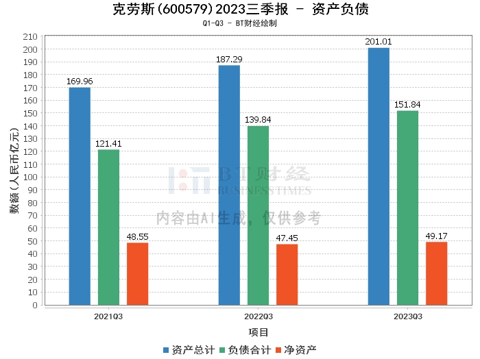 从资产负债方面看,克劳斯公司2023年三季度末的总资产为201.01亿元,较上年度末的200.66亿元略有增长。负债合计为151.84亿元,相比上年度末的165.74亿元有所下降。净资产为49.17亿元,较上年度末的34.92亿元有所增长。资产负债率为75.54%,较上年度末的82.6%有所下降。这表明公司的财务状况有所改善,负债负担减轻。