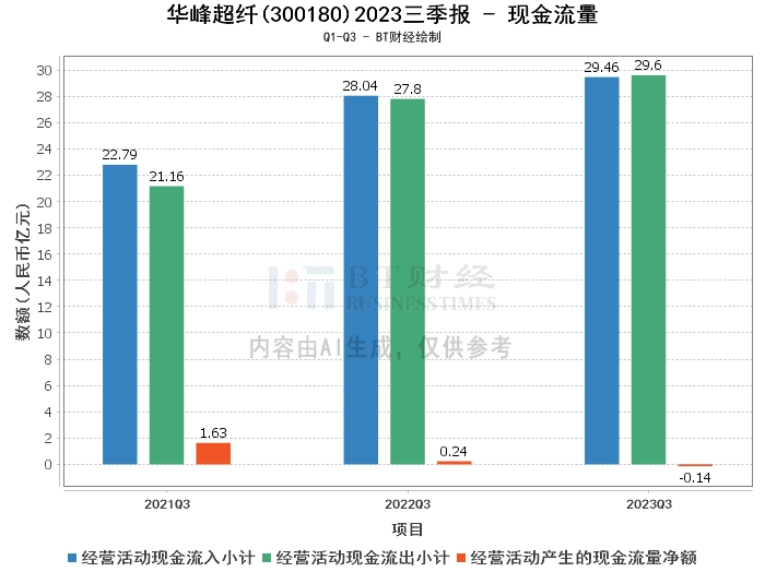 在现金流量方面,华峰超纤2023年三季度经营活动产生的现金流量净额为-1429.65万元,与上年同期的2430.03万元相比,出现了明显的下滑。经营活动现金流入小计为29.46亿元,较上年同期的28.04亿元有所增加。经营活动现金流出小计为29.6亿元,较上年同期的27.8亿元有所增加。这些数据显示,尽管公司的经营活动现金流入有所增加,但由于现金流出的增加,导致经营活动产生的现金流量净额出现了下滑。