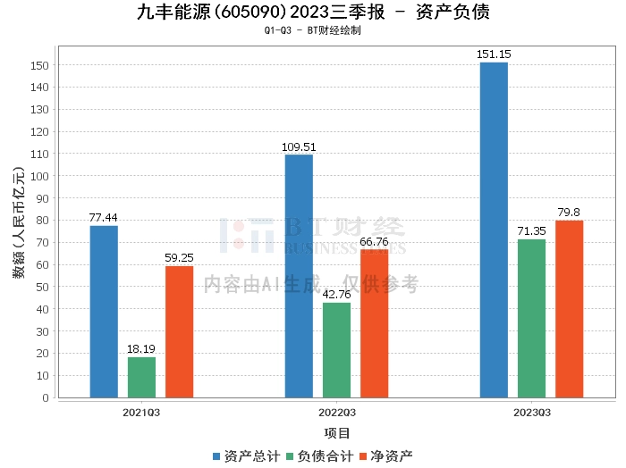 在资产负债方面,九丰能源2023年三季报显示,公司的总资产由上年度末的113.09亿元增长到本报告期末的151.15亿元,增长了33.65%,主要系公司货币资金结余增加、船舶购建相关的固定资产、在建工程增加所致。负债合计由上年度末的41.28亿元增长到本报告期末的71.35亿元。净资产由上年度末的71.81亿元增长到本报告期末的79.8亿元。资产负债率由上年度末的36.5%上升到本报告期末的47.2%。
