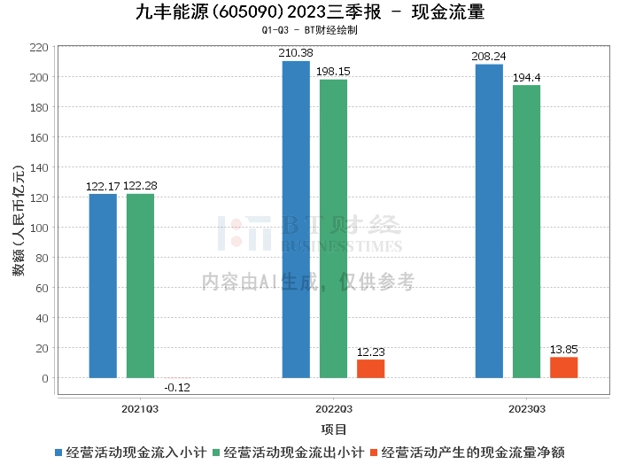 在现金流量方面,九丰能源2023年三季报显示,公司的经营活动产生的现金流量净额由上年同期的12.23亿元增长到年初至本报告期末的13.85亿元,增长了13.25%,主要系期间公司实现盈利及回款情况良好所致。经营活动现金流入小计由上年同期的210.38亿元降低到年初至本报告期末的208.24亿元。经营活动现金流出小计由上年同期的198.15亿元降低到年初至本报告期末的194.4亿元。
