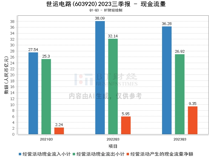 在现金流量方面,世运电路2023年三季度的经营活动产生的现金流量净额为9.35亿元,较上年同期的5.95亿元有大幅提升。经营活动现金流入小计为36.28亿元,较上年同期的38.09亿元有所下降。经营活动现金流出小计为26.92亿元,较上年同期的32.14亿元有所下降。这主要是因为增加用票据结算减少现金流出。