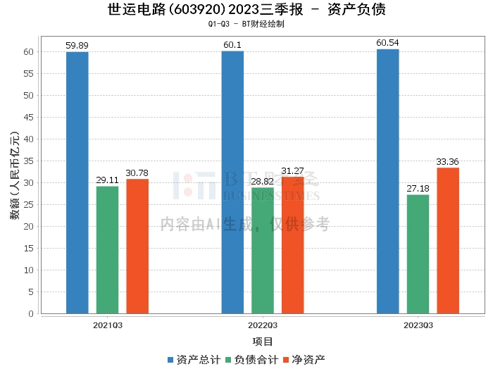 在资产负债方面,世运电路2023年三季度的总资产为60.54亿元,相较于上年度末的58.64亿元有所增长。负债合计为27.18亿元,相比上年度末的25.96亿元有所上升。净资产为33.36亿元,较上年度末的32.68亿元有所提升。资产负债率为44.9%,相比上年度末的44.27%有所增加。