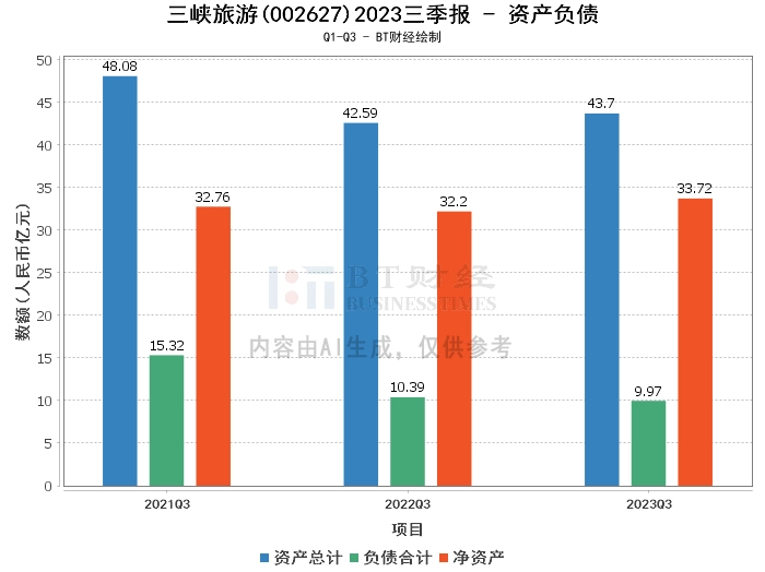 在资产负债方面,三峡旅游2023年三季度的总资产为43.7亿元,相比上年度末的43.83亿元略有下降。负债合计为9.97亿元,较上年度末的11.99亿元有所减少。公司的净资产为33.72亿元,较上年度末的31.83亿元有所增长。资产负债率为22.83%,较上年度末的27.37%有所下降。