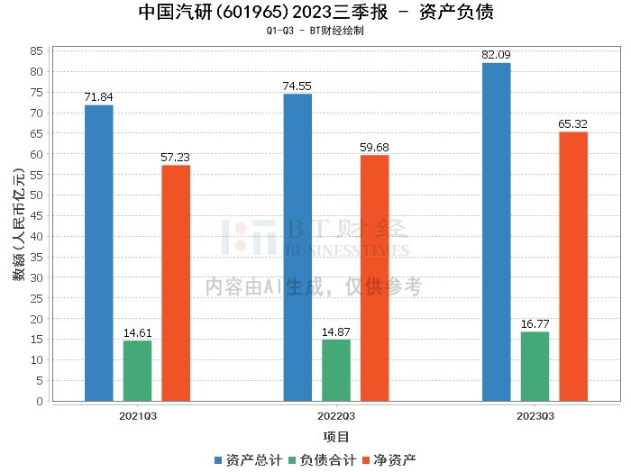 在资产负债方面,中国汽研2023年三季度的总资产为82.09亿元,相比上年度末的80.41亿元有所增长。负债总额为16.77亿元,相比上年度末的18.39亿元有所下降。净资产为65.32亿元,较上年度末的62.01亿元有所增加。资产负债率为20.43%,较上年度末的22.88%有所下降。