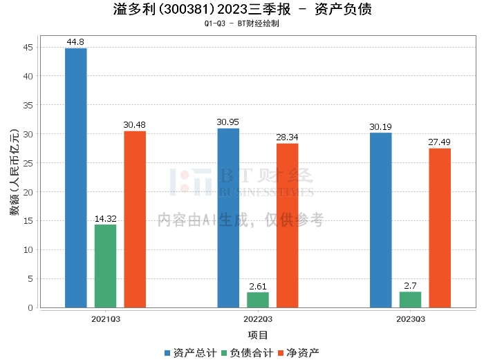 在资产负债方面,2023年三季度末,溢多利的总资产为30.19亿元,相比上年度末的31.72亿元有所减少。负债合计为2.7亿元,较上年度末的3.56亿元有所下降。公司的净资产为27.49亿元,较上年度末的28.16亿元有所减少。资产负债率为8.95%,较上年度末的11.23%有所下降。