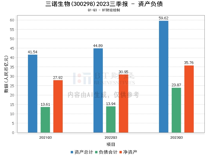 从资产负债方面看,三诺生物2023年三季报显示,公司的总资产为59.62亿元,相比上年度末的61.93亿元有所下降。负债合计为23.87亿元,较上年度末的28.5亿元有所减少。公司的净资产为35.76亿元,较上年度末的33.43亿元有所增加。资产负债率为40.03%,较上年度末的46.02%有所下降。这些变动主要是由于公司新增了一笔长期借款,增加了负债的规模。