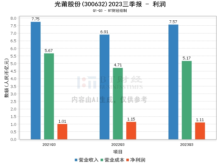 在利润方面,光莆股份2023年三季度的营业收入为7.57亿元,相比上年同期的6.91亿元有所增长。营业利润为1.28亿元,相比上年同期的1.35亿元有所下降。营业成本为5.17亿元,相比上年同期的4.71亿元有所增长。净利润为1.11亿元,相比上年同期的1.15亿元略有下降。这些变动主要系本期汇兑收益较上年同期减少,按账龄计提的坏账准备增加,处置固定资产较上年同期收益增加,控股子公司收到的计入营业外收入的政府补助较上年同期增加,对外捐赠增加等因素影响。