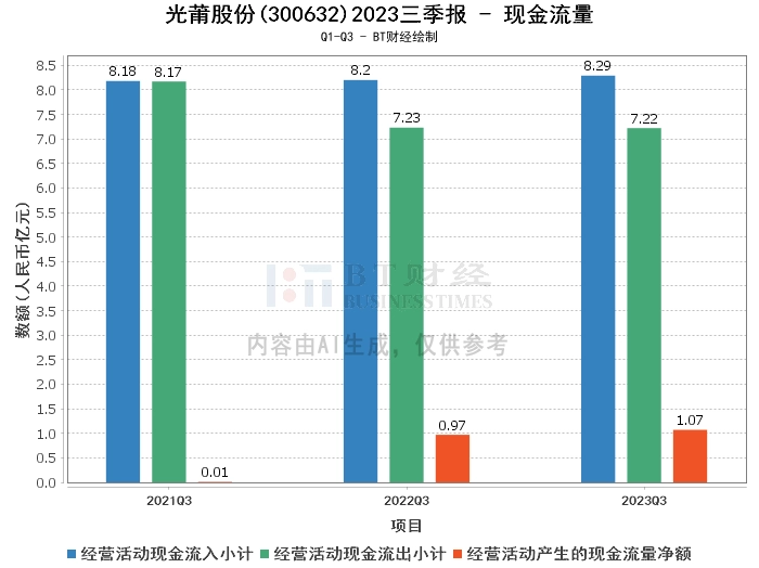 在现金流量方面,光莆股份2023年三季度的经营活动产生的现金流量净额为1.07亿元,相比上年同期的9704.64万元有所增长。经营活动现金流入小计为8.29亿元,相比上年同期的8.2亿元略有增长。经营活动现金流出小计为7.22亿元,相比上年同期的7.23亿元略有下降。这些变动主要系本期理财投资增加,偿还借款增加等因素影响。