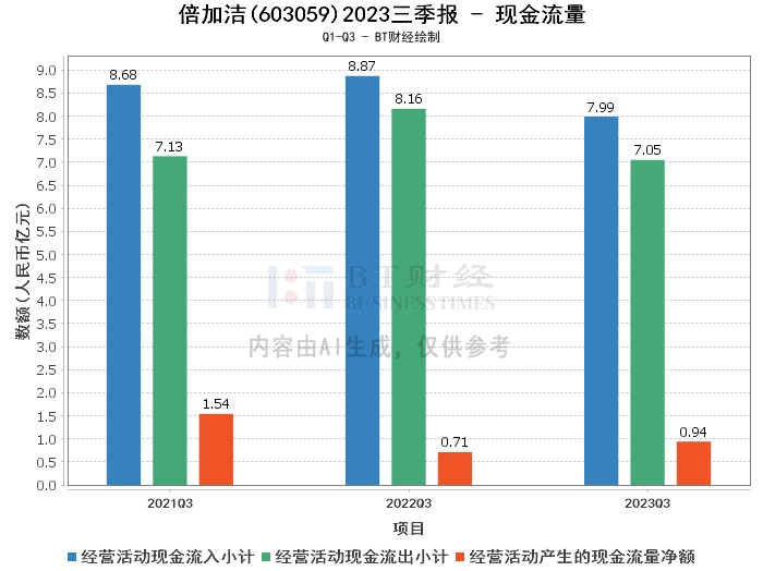 在现金流量方面,倍加洁公司的经营活动产生的现金流量净额在年初至本报告期末为9372.14万元,相比上年同期的7105.48万元增长了31.90%。经营活动现金流入小计在年初至本报告期末为7.99亿元,相比上年同期的8.87亿元有所减少。经营活动现金流出小计在年初至本报告期末为7.05亿元,相比上年同期的8.16亿元有所减少。这主要是由于销售费用投入减少所影响。