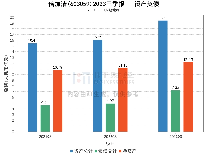 从资产负债方面来看,倍加洁公司的总资产在本报告期末达到19.4亿元,相比上年度末的15.86亿元增长了22.32%。负债合计在本报告期末为7.25亿元,相比上年度末的4.21亿元有所增加。净资产在本报告期末为12.15亿元,相比上年度末的11.65亿元增长了4.26%。资产负债率在本报告期末为37.39%,相比上年度末的26.55%有所上升。