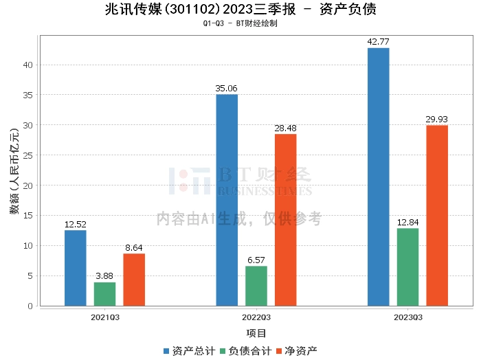 在资产负债方面,兆讯传媒2023年三季度的总资产为42.77亿元,相比上年度末的36.12亿元有所增长。负债合计为12.84亿元,相比上年度末的7亿元增长了较大幅度。净资产为29.93亿元,略高于上年度末的29.12亿元。资产负债率为30.02%,较上年度末的19.37%有所上升。