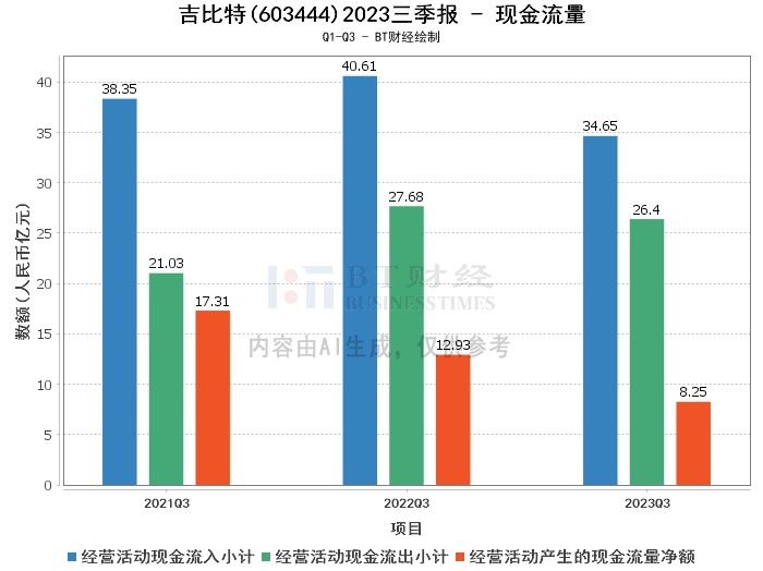 在现金流量方面,吉比特2023年1-9月的经营活动产生的现金流量净额为8.25亿元,较上年同期的12.93亿元有所下降。经营活动现金流入小计为34.65亿元,较上年同期的40.61亿元有所下降。经营活动现金流出小计为26.4亿元,较上年同期的27.68亿元有所下降。这主要是由于公司的核心产品流水减少,导致经营活动现金流入减少。