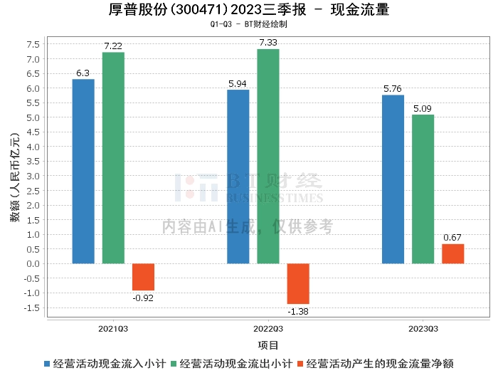在现金流量方面,2023年三季度,厚普股份的经营活动产生的现金流量净额为6654.85万元,相比上年同期的-1.38亿元有明显改善。经营活动现金流入小计为5.76亿元,相比上年同期的5.94亿元有所减少。经营活动现金流出小计为5.09亿元,相比上年同期的7.33亿元有所减少。这些数据显示出公司的现金流状况在改善,存货管理和资金管理得到加强。
