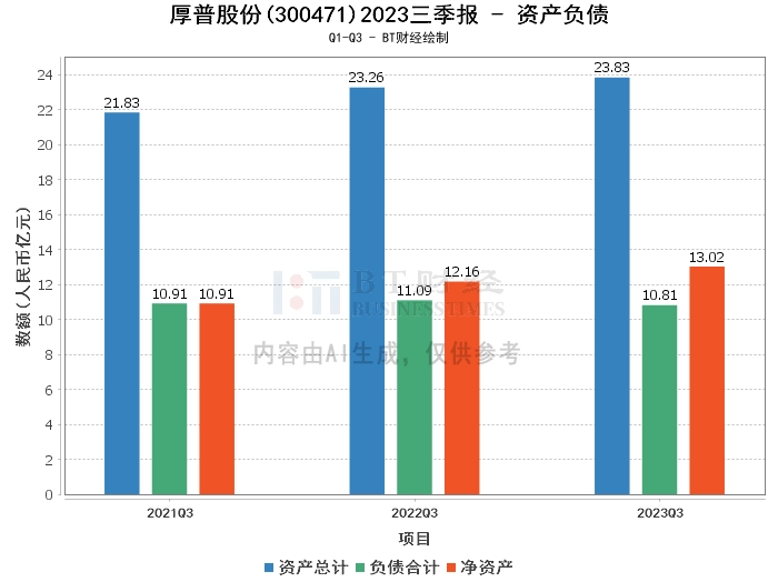 从资产负债方面来看,2023年三季度,厚普股份的总资产为23.83亿元,相比上年度末的23.05亿元有所增长。负债总额为10.81亿元,相比上年度末的11.91亿元有所减少。净资产为13.02亿元,相比上年度末的11.14亿元有所增长。资产负债率为45.37%,相比上年度末的51.68%有所下降。这些数据显示出公司的资产规模在扩大,负债规模在缩小,资产负债结构在优化。