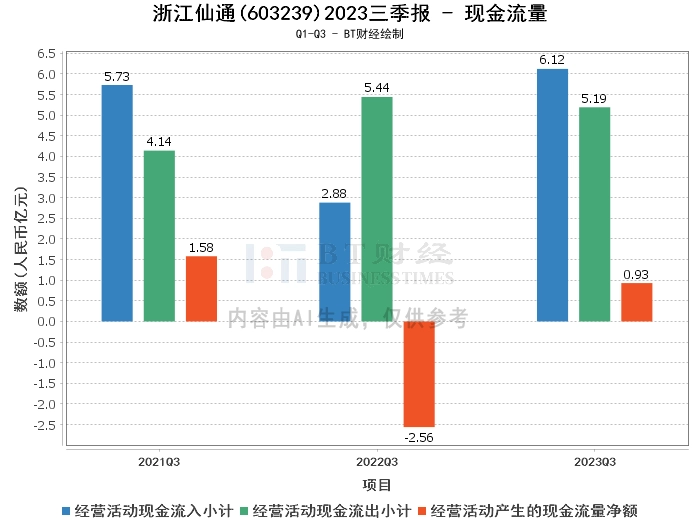 在现金流量方面,浙江仙通2023年三季度的经营活动产生的现金流量净额为9333.65万元,相较于上年同期的-2.56亿元,有显著改善。经营活动现金流入小计为6.12亿元,相较于上年同期的2.88亿元,有所增长。经营活动现金流出小计为5.19亿元,相较于上年同期的5.44亿元,有所减少。这些数据表明公司的现金流状况有所改善。