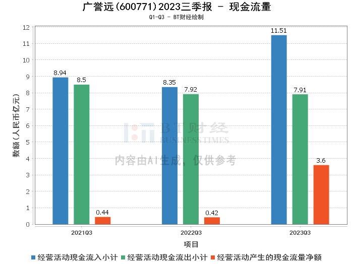 在现金流量方面,广誉远2023年三季度经营活动产生的现金流量净额为3.6亿元,较上年同期的4208.16万元大幅增长754.33%。经营活动现金流入小计为11.51亿元,较上年同期的8.35亿元有所增长。经营活动现金流出小计为7.91亿元,与上年同期的7.92亿元基本持平。这主要是因为公司终端纯销增加,且持续加大清收力度,推行现款发货,致使回款增加所致。