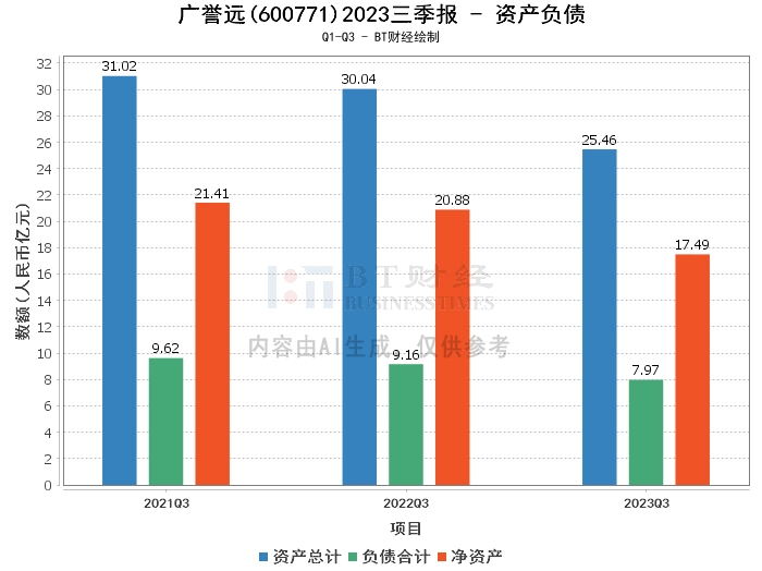 在资产负债方面,广誉远2023年三季度末的总资产为25.46亿元,较上年度末的27.2亿元有所减少。负债合计为7.97亿元,相比上年度末的9.96亿元也有所降低。净资产为17.49亿元,较上年度末的17.24亿元略有增长。资产负债率为31.31%,较上年度末的36.61%有所下降。
