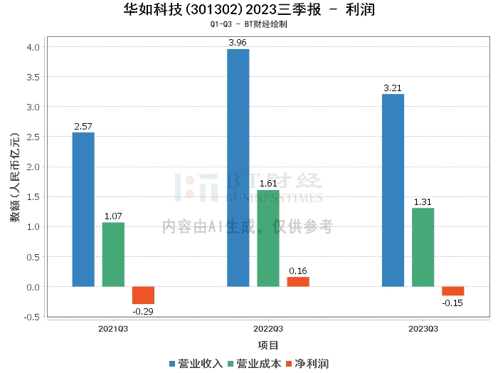 在利润方面,华如科技2023年三季度的营业收入为3.21亿元,相比上年同期的3.96亿元下降了18.85%。营业利润为-3875.45万元,相比上年同期的1479.02万元,公司由盈转亏。营业成本为1.31亿元,较上年同期的1.61亿元有所减少。净利润为-1460.17万元,相比上年同期的1582.86万元,公司由盈转亏。这些变动主要系公司支付采购款金额增加,同时公司支付办公场所租金所致。