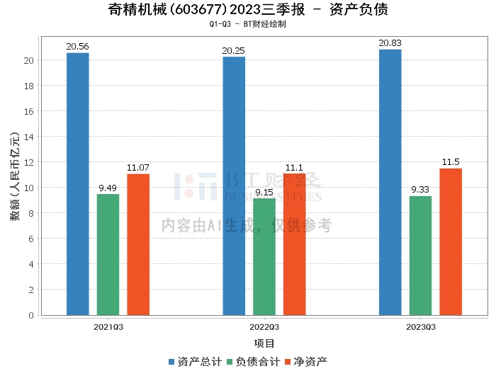 在资产负债方面,奇精机械2023年三季度的总资产为20.83亿元,相比上年度末的20.09亿元有所增长。负债合计为9.33亿元,较上年度末的8.93亿元有所上升。净资产为11.5亿元,较上年度末的11.16亿元有所增长。资产负债率为44.8%,略高于上年度末的44.45%。