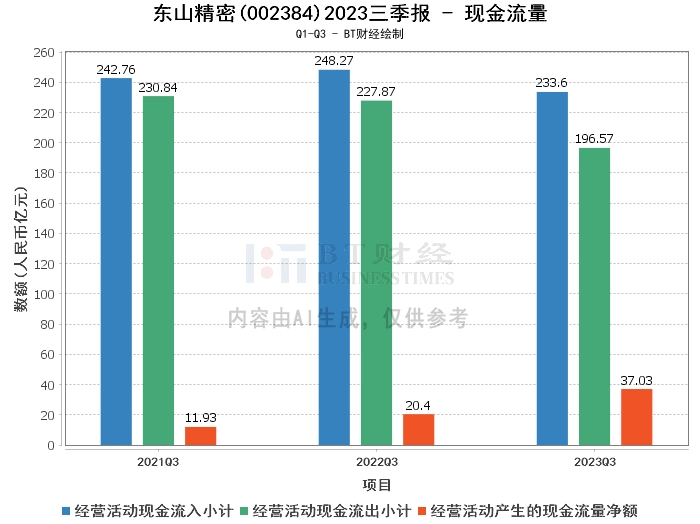 在现金流量方面,东山精密2023年三季度的经营活动产生的现金流量净额为37.03亿元,相比上年同期的20.4亿元增长了81.52%。这主要是因为销售回款稳定,购买商品接受劳务因季度性因素支付的现金减少。