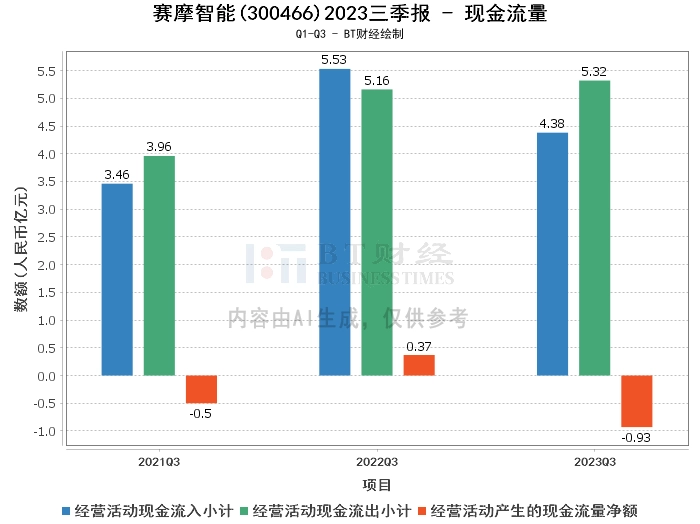 在现金流量方面,2023年三季度,赛摩智能的经营活动产生的现金流量净额为-9332.23万元,较上年同期的3683.54万元有所下降。经营活动现金流入小计为4.38亿元,较上年同期的5.53亿元有所下降。经营活动现金流出小计为5.32亿元,较上年同期的5.16亿元有所增长。这些数据显示,公司的现金流量状况存在一定压力。