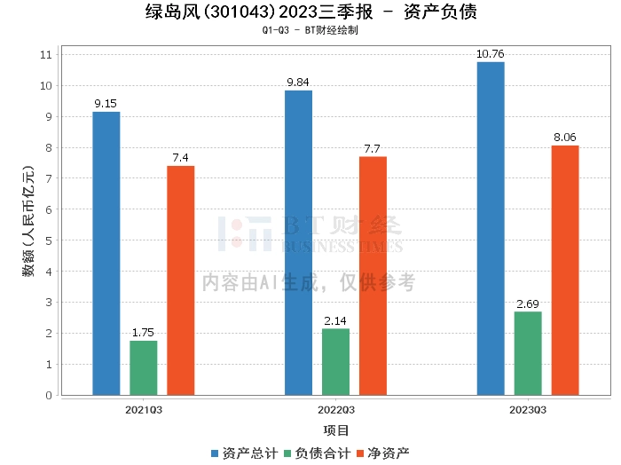 从资产负债表来看,绿岛风2023年三季度末的总资产为10.76亿元,相比上年度末的10.06亿元增长了6.97%。负债合计为2.69亿元,相比上年度末的2.29亿元增长了17.47%。净资产为8.06亿元,相比上年度末的7.76亿元增长了3.88%。资产负债率为25.05%,相比上年度末的22.82%有所上升。这些变化主要是由于本期销售增加,且原材料采购,工资薪酬和支付广告等费用减少所致。